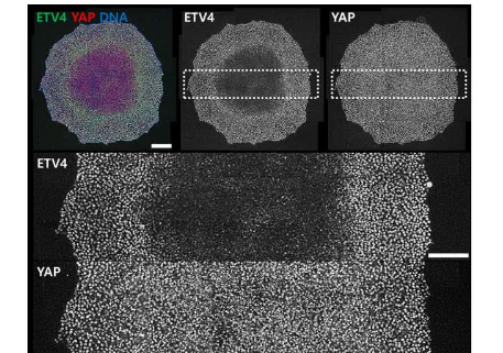 在干细胞的分化过程中,ETV4在细胞密度低的区域引导中内胚层的形成,同时在细胞密度高的区域促进神经外胚层的发育。研究人员发现,一种新的机械传感器 ETV4 将细胞密度动态与干细胞分化联系起来。